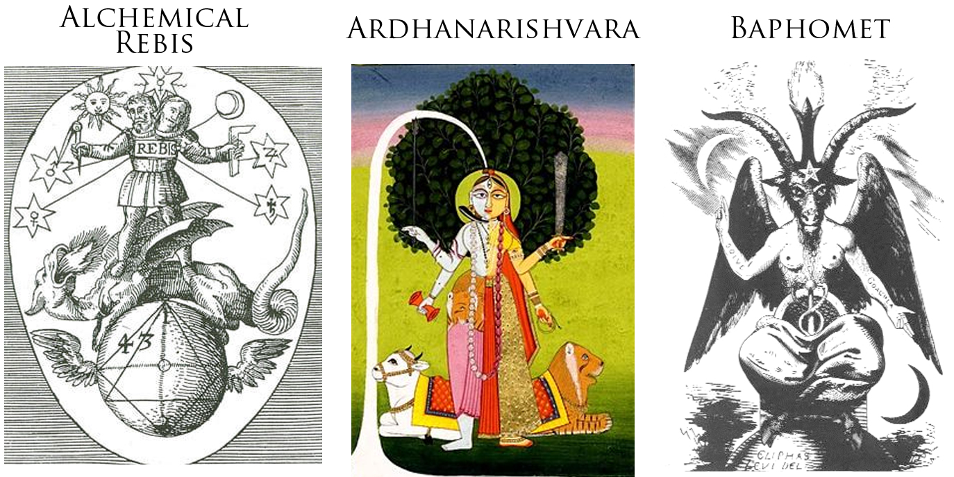 Basicamente, o iogue se identifica com Shiva e todas as suas propriedades correspondentes; a mulher se identifica com Shakti, o poder primordial inerente a todo o movimento. Isto é semelhante à ideia da Mulher Escarlate como um avatar terrena de Babalon. Sua união é um hieros gamos ou “casamento sagrado”: a união do masculino e feminino é visto como a união de Shiva e Shakti, que pode ser simplificado como o Assunto final e o objeto final. Esta união cria o “Shiva andrógino”, conhecida como Ardhanarishvara, que significa literalmente Ardhanarishvara é essencialmente uma forma Dois-em-Um representando ambos os elementos fundidos num só “o Senhor que é metade mulher.”: Imagens quase idênticas são encontradas em Baphomet e do alquímico Hermafrodita ou “Rebis”.